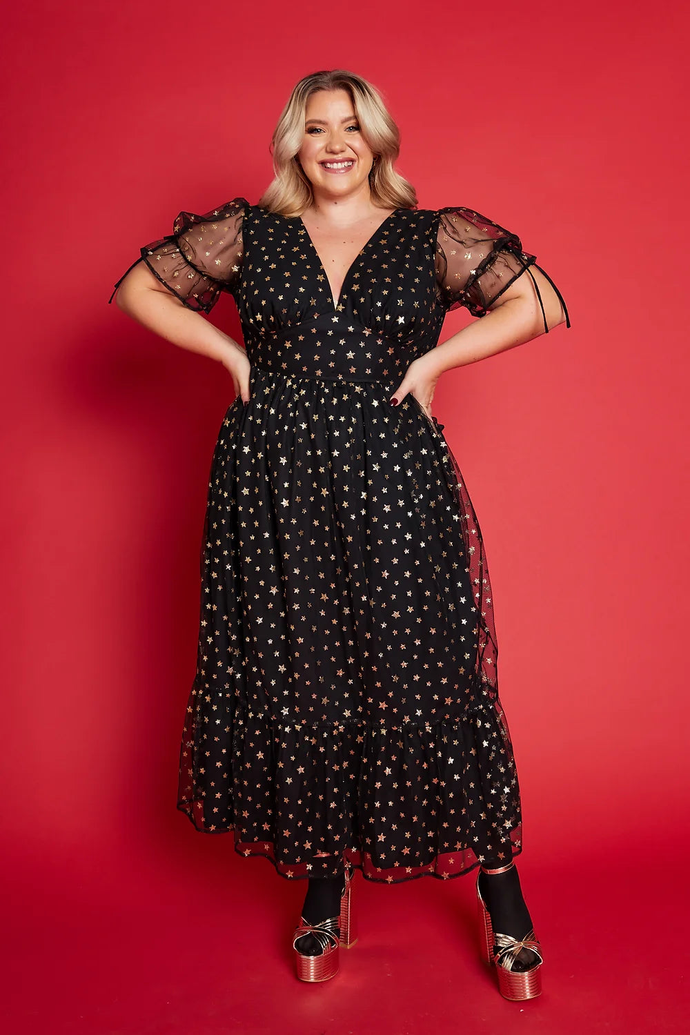 The ultimate party dress features a gold glitter star tulle that will make you stand out at any occasion. Its fitted bodice and v neckline create a timeless and super flattering look, while the sheer sleeves add a touch of elegance.