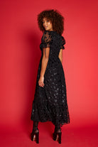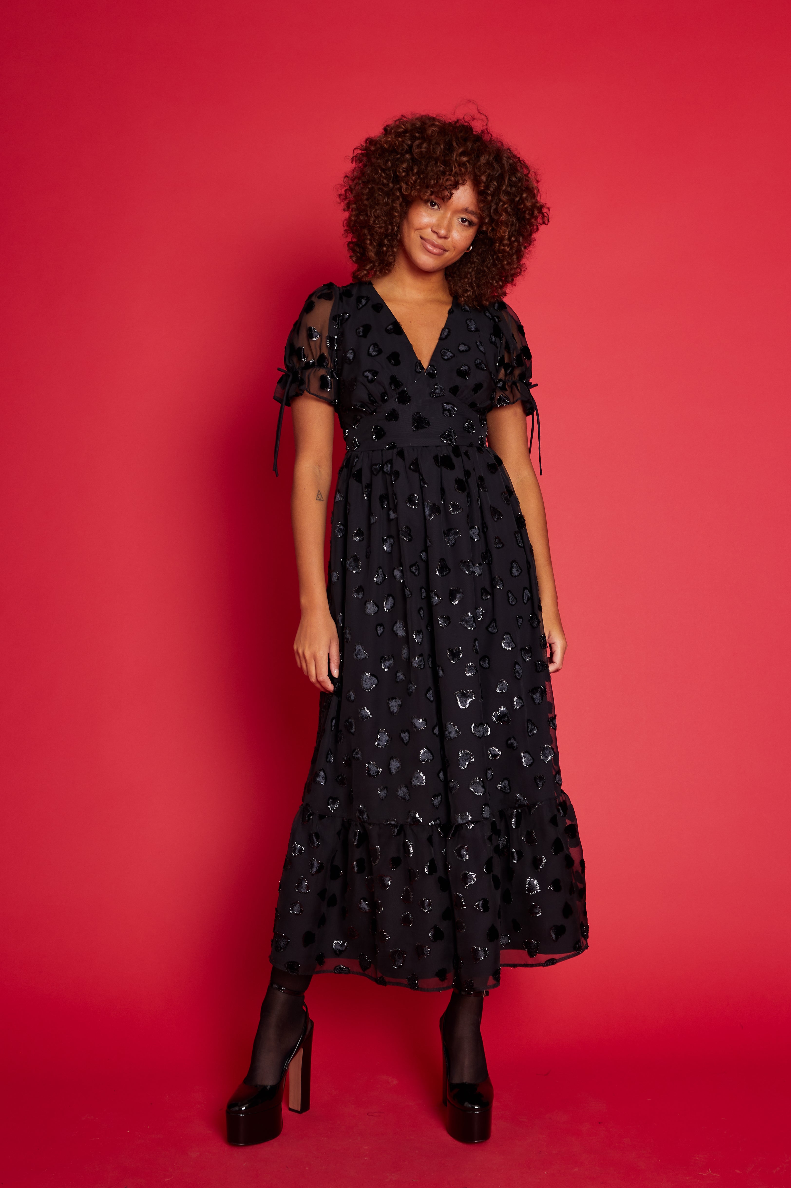 The ultimate party dress features a glitter heart fabric that will make you stand out at any occasion. Its fitted bodice and v neckline create a timeless and super flattering look, while the sheer sleeves add a touch of elegance.