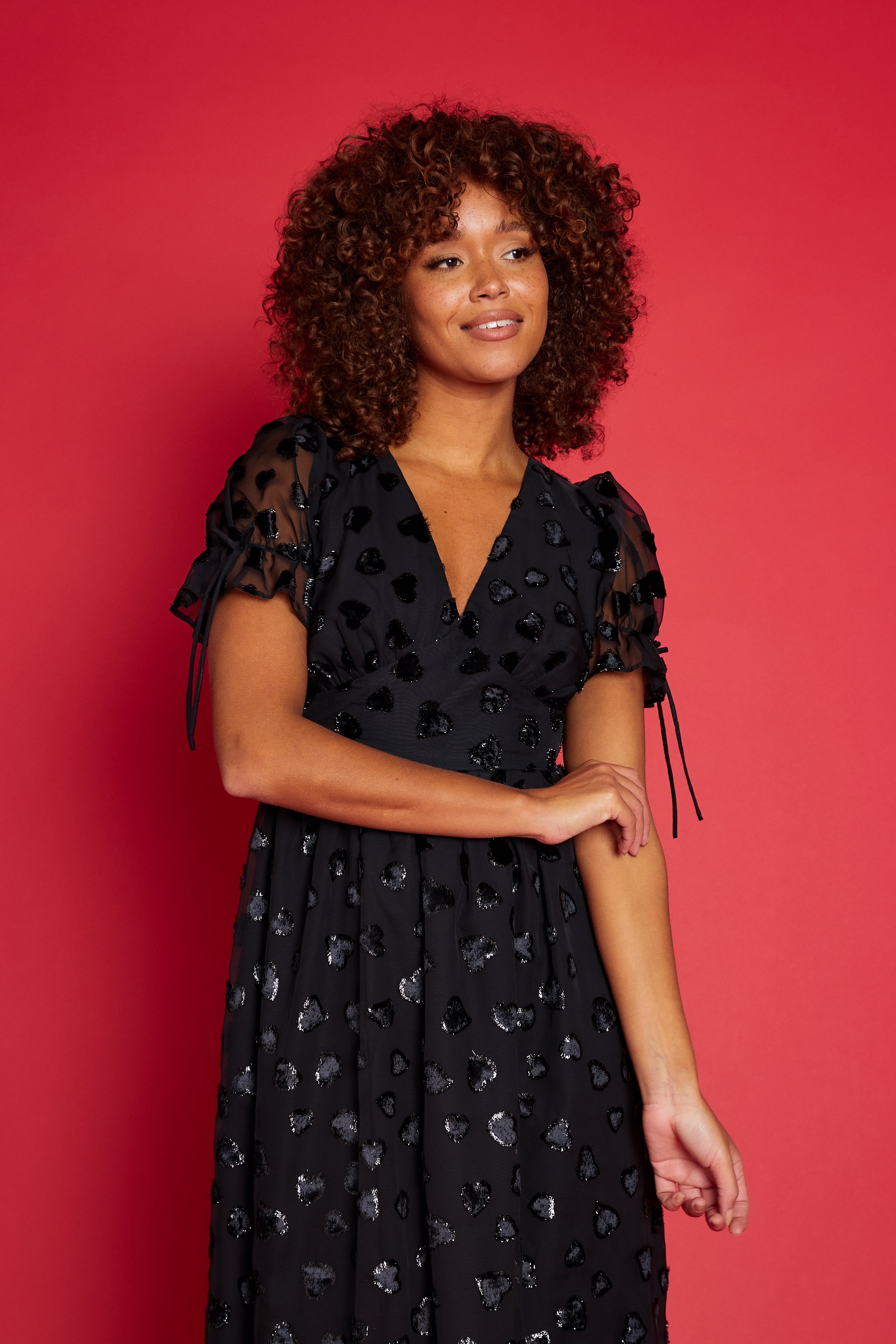 The ultimate party dress features a glitter heart fabric that will make you stand out at any occasion. Its fitted bodice and v neckline create a timeless and super flattering look, while the sheer sleeves add a touch of elegance.