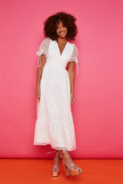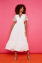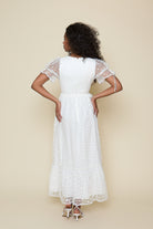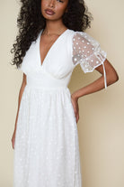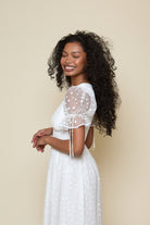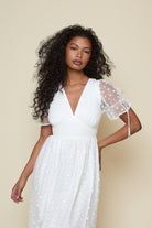 Be the cool bride in our Paloma Dress! With ivory glitter star tulle and sheer sleeves, this midi length dress is fully lined in 100% cotton for comfort. Timeless and perfect for upcoming brides!